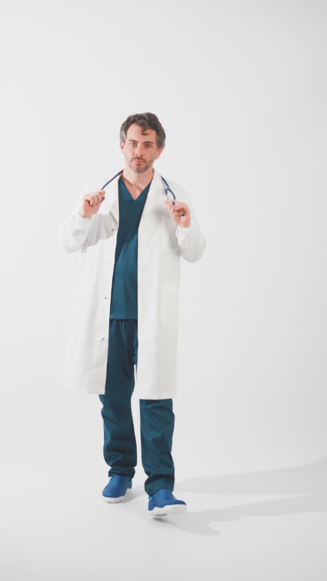 Completo medico professionale composto da casacca con scollo a V e pantaloni con vita elastica e coulisse. Realizzato in tessuto leggero e traspirante (65% poliestere, 35% cotone), sanforizzato e resistente a lavaggi industriali fino a 90°C. Latex free, DPI di Categoria I con marchio CE. Massima comodità e protezione per l’uso quotidiano.