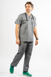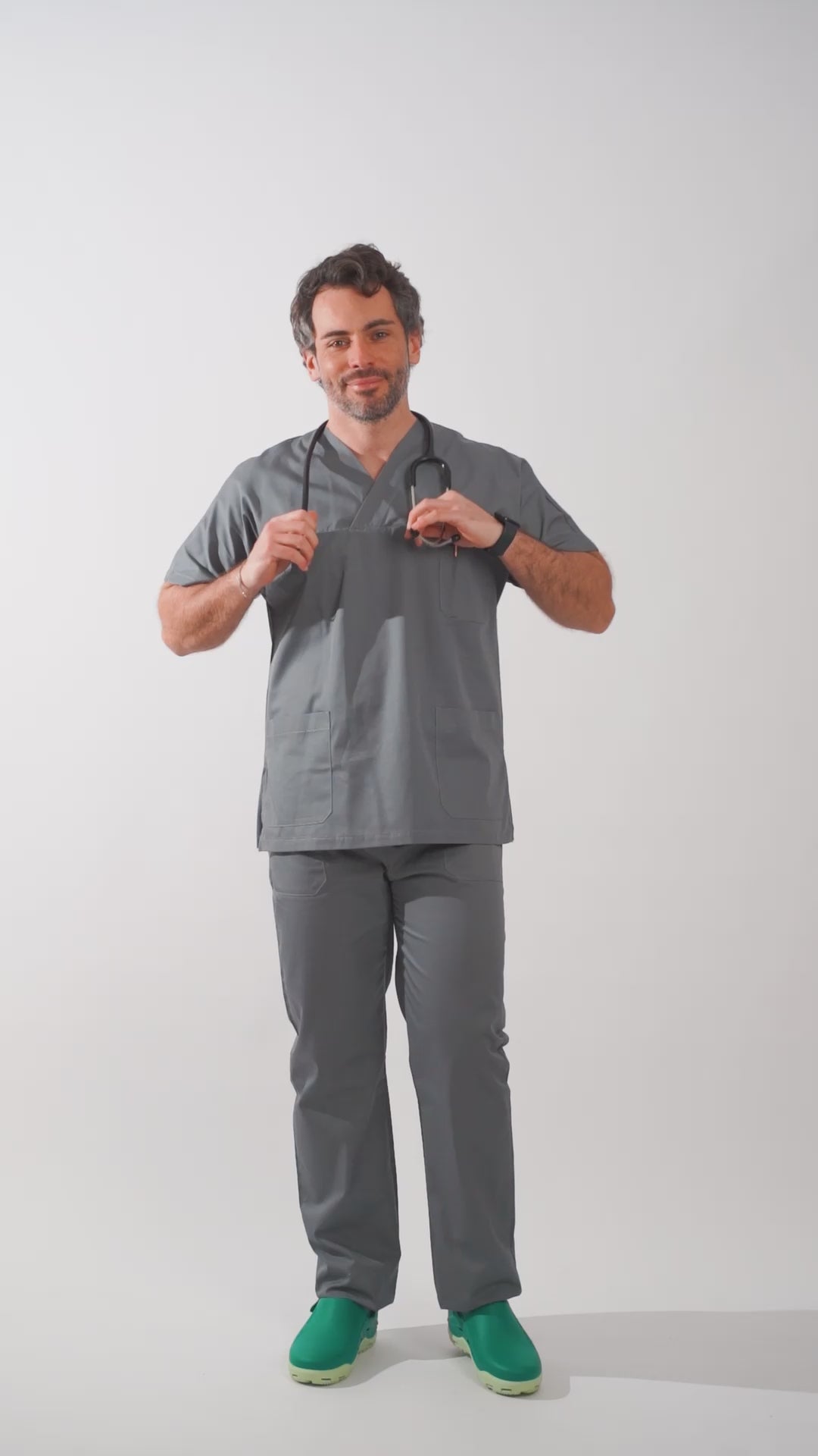 Completo medico professionale composto da casacca con scollo a V e pantaloni con vita elastica e coulisse. Realizzato in tessuto leggero e traspirante (65% poliestere, 35% cotone), sanforizzato e resistente a lavaggi industriali fino a 90°C. Latex free, DPI di Categoria I con marchio CE. Massima comodità e protezione per l’uso quotidiano.
